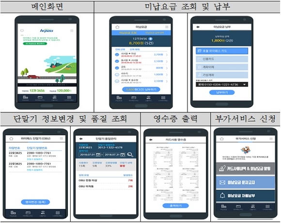 이 외에도 △지문인식을 이용한 간편 로그인 △하이패스 단말기 등록정보 조회/변경 △단말기 품질 조회(정상동작 여부 확인을 위한 에러율 조회) △환불 통행료 조회 등의 기능이 추가됐다.