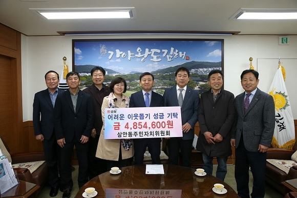 경남 김해 삼안동주민자치위원회는 11일 관내 어려운 이웃을 위해 사용해 달라며 성금 485만 4600원을 김해시에 기탁했다.