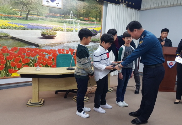 지난 11일 동현초등학교를 방문한 정성학 금정경찰서장은 선행을 베푼 학생 3명을 격려하고 표창장과 부상을 수여했다.