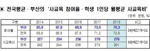 최근 5년 동안 부산의 사교육 참여율을 보면 2014년 65.8%, 2015년 67.8%, 2016년 69.8%, 2017년 73.0%로 매년 증가세를 이어오다 지난해 70.3%를 기록해 하락세로 돌아섰다.