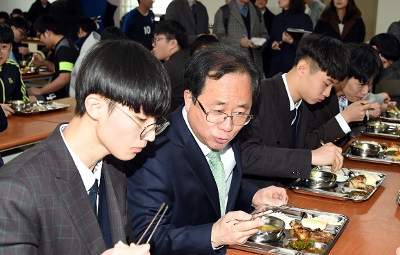 이날 김석준 시교육감은 학교 급식종사원과 함께 학생들에게 배식한 뒤 학생들과 함께 식사하며 무상급식 및 학교생활에 대한 사항들을 듣는 시간을 보냈다.
