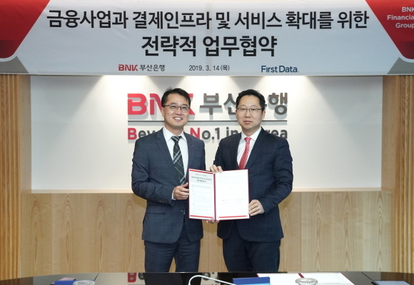BNK부산은행이 지난 14일 오후 부산은행 본점에서 글로벌 지불결제 솔루션 기업인 ‘퍼스트데이터코리아’와 함께 ‘금융사업, 결제인프라, 서비스 범위 확대를 위한 업무협약’을 체결했다고 15일 밝혔다.