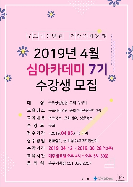 구포성심병원은 4월 12일부터 6월 28일까지 매주 금요일 오후 4시부터 5시까지 총 12주의 과정으로 심(心)아카데미 7기를 개설한다고 15일 밝혔다.
