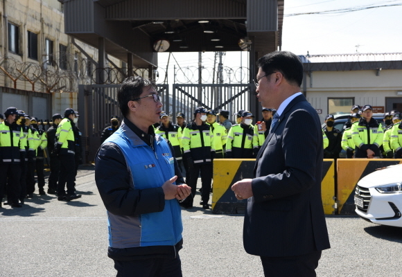 부산 남구 박재범 구청장이 지난 14일 오후 감만동 미8부두 앞에서 직접 ‘주피터 프로젝트 반대 입장’을 발표했다.