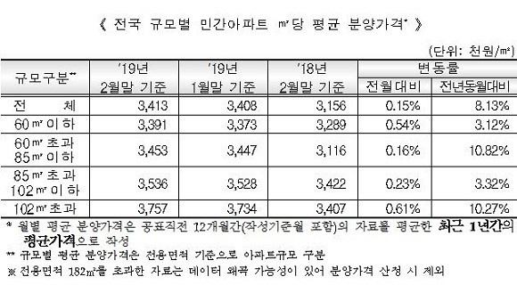 전국 민간아파트 평균 분양가의 규모별 분석 결과, 전월대비 전용면적 102㎡ 초과(0.61%), 전용면적 60㎡ 이하(0.54%) 순으로 상승치가 높았다.