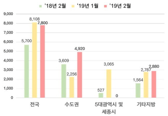 기타지방은 총 2880세대로 전년동월대비 84%(1316세대)가량 증가했으며 5대 광역시와 세종시는 이달 신규분양이 이뤄지지 않았다.