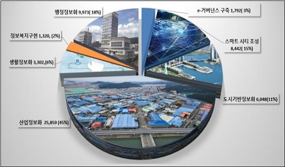 정보화 사업에 시는 총 567억원을 투자할 계획으로 분야별로 ▲산업정보화에 258억 6000만원(45%) ▲행정정보화에 99억 7000만원(18%) ▲스마트시티 조성에 84억 4000만원(15%) ▲도시기반정보화에 60억 5000만원(11%) ▲생활정보화에 33억원(6%) ▲e-거버넌스 구축에 17억 9000만원(3%) ▲정보 복지에 13억 2000만원(2%) 순이다.