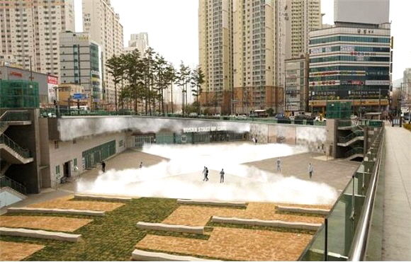 이는 미세안개가 분사돼 공기 중의 열과 미세먼지를 흡착해 폭염 시 주변 온도를 3~5℃ 정도 낮추고 미세먼지 발생 시 ‘에어커튼’ 효과로 미세먼지를 피할 수 있는 야외공간을 만든다는 것이다.