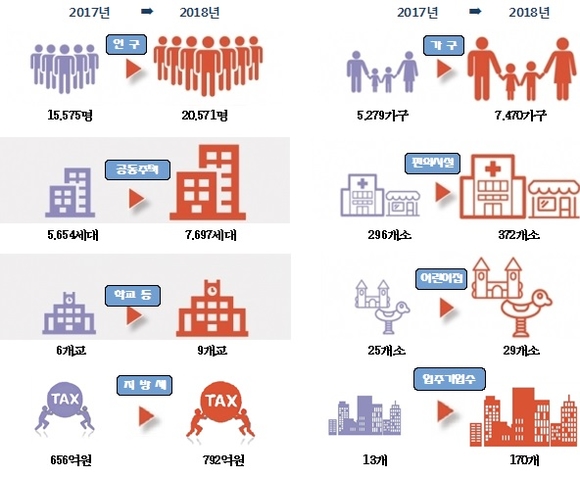 지난해 말 경남혁신도시 인구는 2만 571명으로 2만 명을 돌파했으며, 2017년 말 대비 1년 사이에 4996명 증가했다.