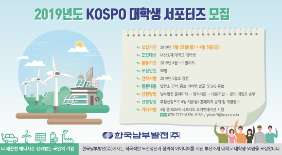 한국남부발전㈜(KOSPO)이 발전 산업에 대한 발전 방향과 지역 상생 방안을 모색하고 사회적 가치 창출을 위해 ‘대학생 서포터즈’를 모집한다.
