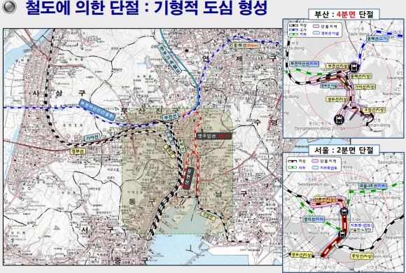 특히 부산 경부선 통과 구간은 부산 도심부를 100년 넘게 4분면으로 단절해 도심 기형화를 지속시키고 있다고 문제를 제기했다.