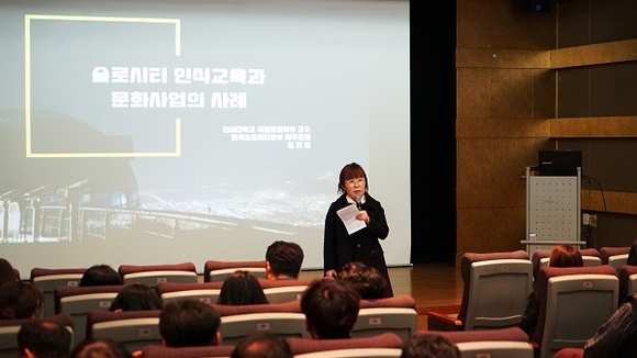 이날 강연에는 장희정 한국슬로시티본부 사무총장(신라대 국제관광학부)을 초청, '슬로시티 인식교육 및 문화사업 사례연구'라는 주제로 슬로시티의 기본 취지와 우리 삶의 관계에 대한 이야기를 나눴다.