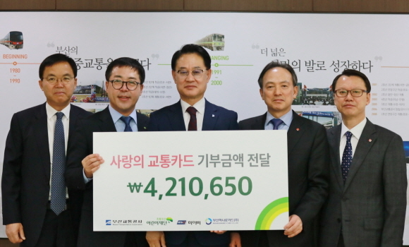 부산교통공사는 27일 오전 본사 7층에서 ㈜마이비와 함께 교통카드 기부함을 통해 수거된 성금 421만원을 초록우산어린이재단 ‘저소득층 아동 지원기금’으로 전달했다고 밝혔다.