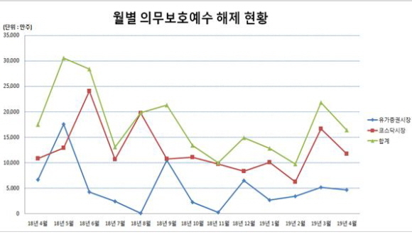 2019년도 4월 의무보호예수 해제 주식 수량은 전월대비 24.7%(5407만주) 감소했으며 전년동월대비 5.9%(1032만주) 감소한 것으로 분석된다.