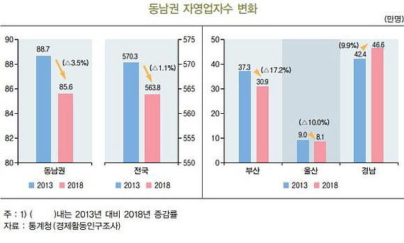 해당 보고서에 따르면 동남권 자영업자는 최근 5년(2013~2018년) 동안 88만 7000명에서 85만 6000명으로 3만 1000명 줄어들었다. 이는 지역 경기 부진에 따른 소비 위축 등의 영향으로 감소폭(3.5%p)이 전국 평균(1.1%p)보다 큰 것으로 나타났다.
