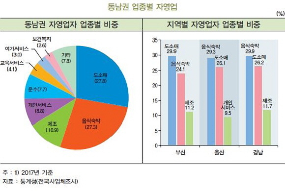 업종별로는 전통 서비스업으로 분류되는 도소매업과 음식 숙박업 비중이 높은 것으로 분석됐다. 지난 2017년 기준 동남권 자영업자 가운데 도소매업(27.8%)과 음식 숙박업(27.3%) 비중은 55.1%에 달했다. 이는 해당 업종이 상대적으로 창업 진입장벽이 낮기 때문인 것으로 보고 있다.