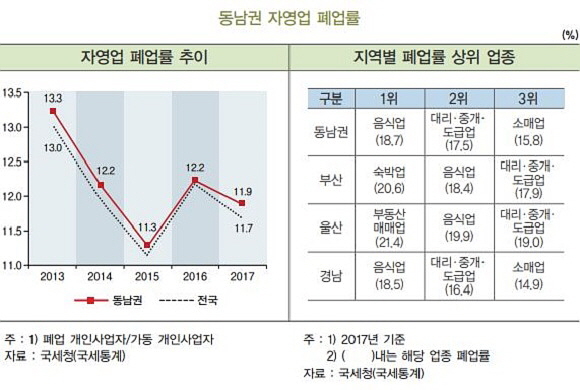 높은 자영업 밀집도에 따른 경쟁심화와 관련업종의 소비 부진으로 동남권 자영업 폐업률도 높은 수준에 머물러 있다고 지적했다. 지역 자영업 폐업률은 지난 2017년 기준 11.9%로 전국보다 높은 것으로 나타났다.