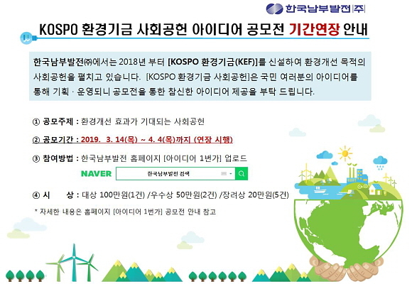 한국남부발전㈜(KOSPO)이 국민 수요에 맞는 맞춤형 복지 지원을 위해 시행하는 KOSPO 환경기금 사회공헌 아이디어 공모전 접수를 오는 4일까지 연장한다.