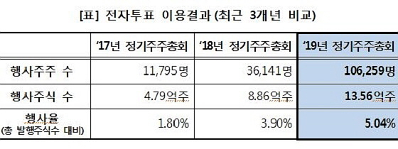 주주의 전자투표 행사율은 발행 주식수 대비 5.04%로 전년(3.90%)대비 29.2% 늘어난 수치로 조사됐다.