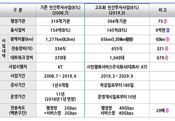 이번 고도화 사업은 기존에 포설된 광케이블은 재활용하며 선로 이원화를 위한 광케이블을 추가로 포설하는 사업으로 네트워크 장비 1049대 설치, 망 운영센터 리모델링 등 총 145억원이 소요된다.