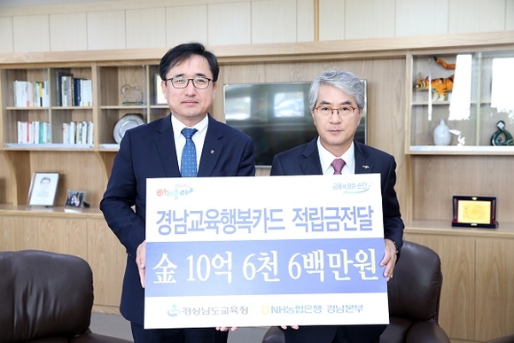 올해 포인트 적립금은 10억 6천여만 원으로 최초로 10억 원대를 달성했다. 김한술 농협은행 경남본부장은 4일 교육감실에서 박종훈 교육감에게 포인트 적립금 전달식을 가졌다.