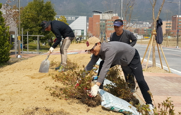 이날 식목 행사에 참여한 60명의 부산대 직원들은 2000㎡ 규모의 화단면을 손수 고르고 영산홍, 철쭉 등 관목 1660주와 스트로브잣나무 등 교목 45주의 식재 작업을 했다.
