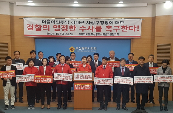김대근 부산시 사상구청장이 선거법 위반 혐의로 검찰에 고발된 가운데 자유한국당 부산시당이 9일 부산시의회에서 기자회견을 열고 김대근 구청장에 대한 엄정한 수사를 촉구했다.