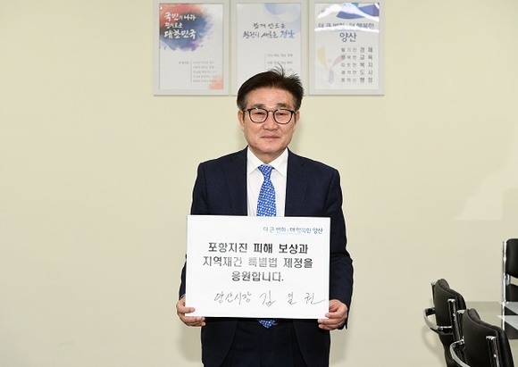 김일권 양산시장이 15일 허성무 창원시장으로부터 지명을 받아 포항지진 특별법 제정을 위한 국민청원 챌린지 릴레이 캠페인에 동참했다.