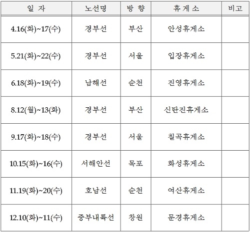 먼저 오는 16~17일 경부고속도로 안성휴게소(부산방향)를 시작으로, 매월 2일간 이용객이 많은 고속도로 주요 휴게소 8개소를 순회하며 검사 및 점검할 계획이다.
