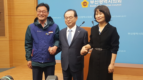 오거돈 부산시장과 박인영 부산시의회 의장, 김재하 민주노총 부산본부장은 17일 오전 9시 45분경 긴급 기자회견을 열고 강제징용 노동자상 설치에 대한 합의를 봤다고 밝혔다.