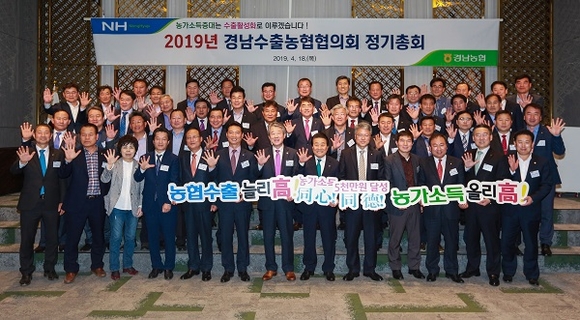 경남농협은 18일 창원시 상남동 리베라컨벤션에서 수출농협 조합장 등 관계자 60여명이 참석한 가운데 '2019년 경남수출농협협의회 정기총회'를 열고 농식품 수출 증진에 최선을 다할 것을 결의했다.