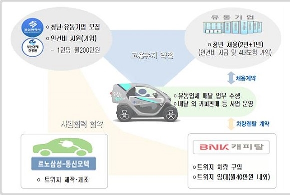 청춘희망카 사업은 부산 청년들에게 친환경 배달이 가능하도록 개조한 전기차 ‘트위지’ 차량을 임대하고, 참여 유통기업에는 청년 채용을 지원해 배달 업무 및 소규모 창업을 지원하는 사업이다.