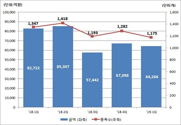 예탁원 자료에 따르면 올 1분기 DLS 발행금액은 6조 4000억원으로 지난해 4분기 대비 3000억원(4.2%) 감소했으며 전년동기대비 1조 8000억원(22.3%) 감소한 것으로 나타났다.