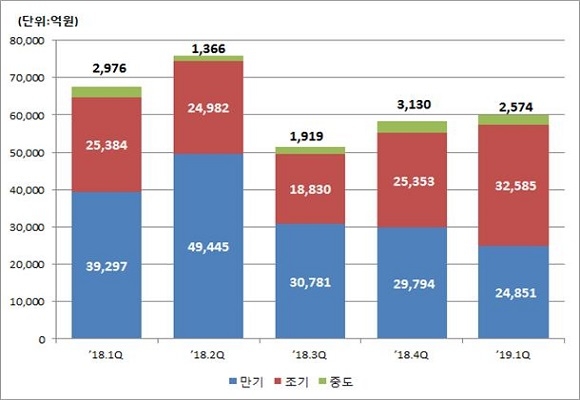 발행 형태별로 조기상환은 3조 2000억원으로 지난해 4분기 대비 7000억원(28.5%) 증가했으나 만기상환은 2조 4000억원으로 직전분기 대비 5000억원(16.6%) 감소한 것으로 나타났다.