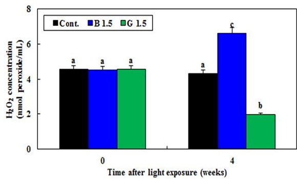 반면 1.5W/㎡ 세기의 청색 파장의 빛에 4주 동안 노출한 금붕어 망막에서는 형광등에서 사육한 개체에 비해 스트레스 반응 물질인 활성산소 농도가 약 46% 증가한 것으로 나타났다. 사멸된 세포의 양 또한 증가했다.