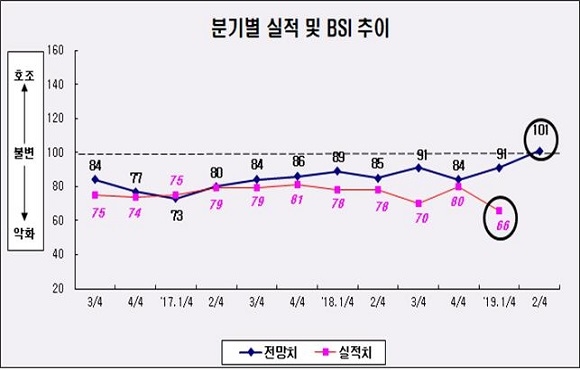 오는 2분기 BSI가 전반적으로 호전된 것과 달리 1분기 실적 지수는 66을 기록해 되려 2012년 4분기 64를 기록한 이후 최악의 수준을 보였다.