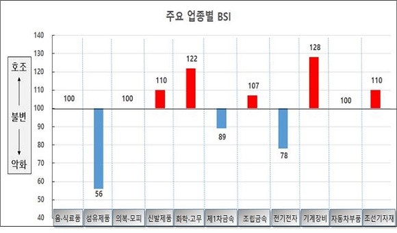 업종별로는 신발(110)과 조선 산업 회복으로 수요 증가가 예상되는 화학·고무(122), 조립 금속(107), 기계·장비(128), 조선기자재(110) 등의 업종이 BSI 100을 넘겼다.