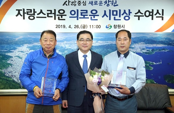 경남 창원시는 26일 접견실에서 위급한 상황에서도 빛나는 시민정신을 실천해 소중한 생명을 구한 김형길, 박석원 시민에게 자랑스러운 '의로운 시민상'을 전달했다.
