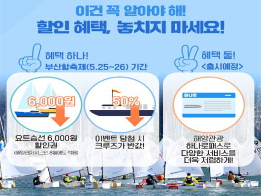 또 오는 11월까지 사용할 수 있는 요트 이용요금 6000원 할인권을 선착순 5000장 지급한다. 이 할인권은 내달 25~26일 부산항 축제 기간, 8월 KIMA WEEK 기간에 배포될 예정으로 QR코드를 내려받은 뒤 이를 가지고 해당 업체에 예약한 뒤 승선하면 된다.