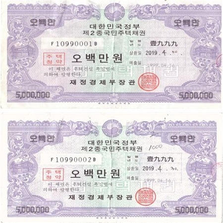 해당 채권은 제2종 국민주택채권으로서 지난 1999년 4월 30일 만기 20년물로 발행된 것으로 2매, 권면액 500만원짜리다.