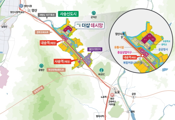입지여건은 부산도시철도 1호선 노포역과 경남 양산시 북정동을 잇는 ‘양산도시철도’ 내송역(예정)이 단지와 7분 거리에 위치할 예정이어서 부산시와의 접근성이 탁월하다. 노포-양산 간 도시철도(11.4㎞)는 7개 역사가 들어설 예정으로 이중 2개역이 사송신도시에 들어선다.