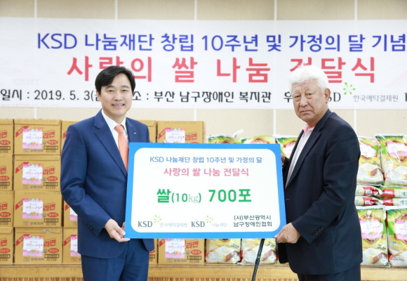 한국예탁결제원 KSD 나눔재단이 창립 10주년과 가정의 달을 맞아 3일 오후 부산시 남구 장애인복지관에서 사회 배려 계층을 위한 사랑의 쌀 나눔 행사를 열었다고 밝혔다.