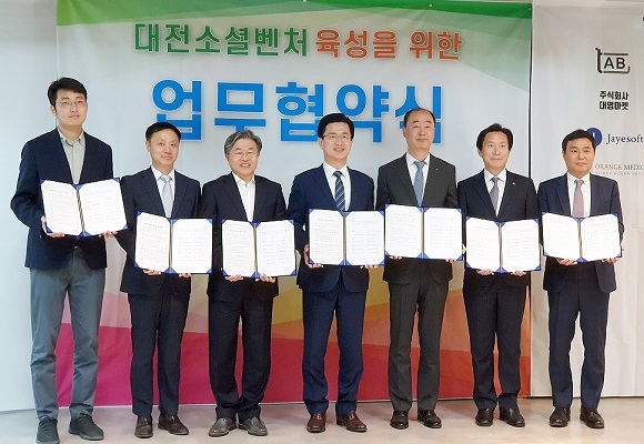 기술보증기금(기보)과 대전시, 대전창조경제혁신센터, K-water, 사회적가치연구원 등 6개 기관이 7일 오후 대전도시공사 본사에서 ‘대전 소셜벤처 육성 위한 협약’을 맺었다고 밝혔다.