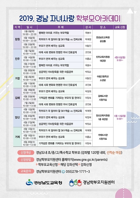 경남도교육청은 학부모를 대상으로 '2019년 경남 자녀사랑 학부모아카데미'를 5, 6월 창원 등 6개 지역에서 운영한다고 8일 밝혔다.