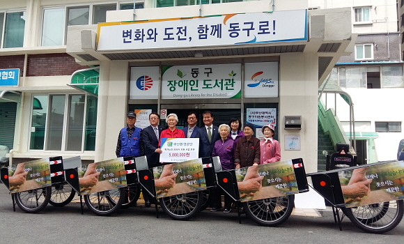 부산환경공단 더 나눔 봉사단이 8일 어버이날을 맞아 폐지 수거로 생계를 이어가는 저소득 어르신들에게 특수재질로 제작된 폐지수거용 리어카 5대와 연간 생활지원금을 지원했다고 밝혔다.