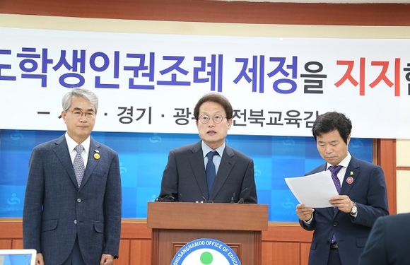 그러면서 “우리나라 교육이 양적 성장을 이룬 이면에 입시 위주의 경쟁교육, 아이들의 낮은 행복지수, 청소년 자살과 학교폭력 등의 아픈 그늘을 갖고 있다”며 “교육자의 양심상 학생들의 아픔을 외면해서는 안 된다는 생각과 어린이·청소년이 행복한 학교공동체를 만들어야 한다는 뜻을 모아 학생인권조례를 제정했다”고 주장했다.