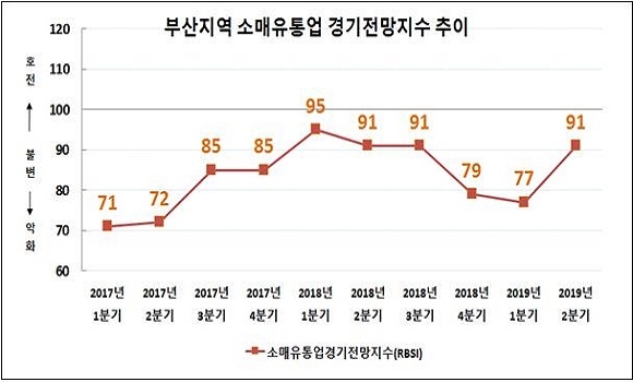 조사에 따르면 2분기 부산 소매유통업 경기전망지수(RBSI)는 91을 기록했다. 이는 지난 분기 77에 비해 지수가 다소 회복된 수준이지만 여전히 100을 못 넘겼다.