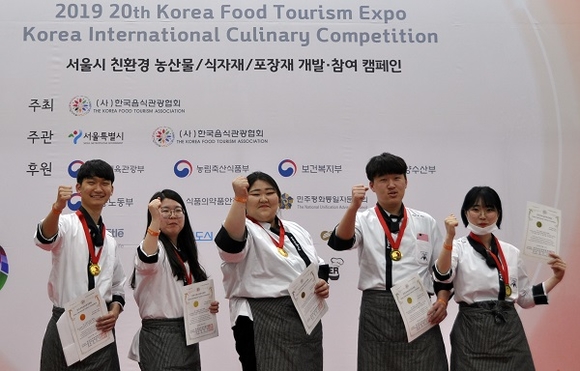 이번 조리경연대회 참가팀은 외식프랜차이즈학과 2학년 윤설희·이승연·이지윤·이재경 학생과 1학년 박지훈 학생 등 총 5명으로 구성됐으며, 학과 창설 후 처음 참가한 조리경연대회에서 금상을 수상하는 쾌거를 이뤘다.