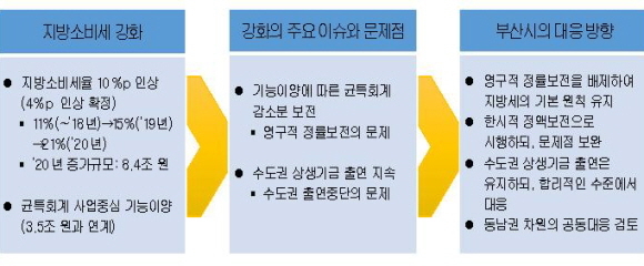 보고서를 작성한 박충훈 연구위원은 부산시 대응 방향으로 ▲영구적 정률보전을 배제한 지방세 기본 원칙 유지 ▲한시적 정액보전으로 시행하되 문제점을 보완 ▲수도권 상생기금 출연은 유지하되 합리적 수준에서 대응 ▲동남권 공동대응 검토를 제안했다.