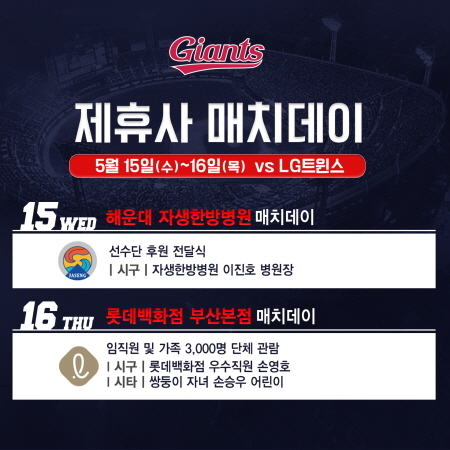 롯데 자이언츠가 오는 15일과 16일 열리는 LG와의 주중 홈경기를 맞아 제휴사 매치데이를 열고 각종 이벤트를 진행한다고 13일 밝혔다.
